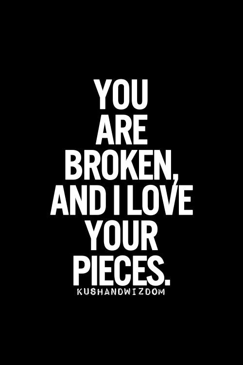I have often said that it is the broken people in my life that make me feel whole. Like our pieces fit together somehow in a strange abstract portrait. What I am missing, you lend me. Hiding the bodies of our experiences in each other’s back yards. It is the only love I believe. And the picture above becomes the mantra we speak to each other: You are broken and I love your pieces.